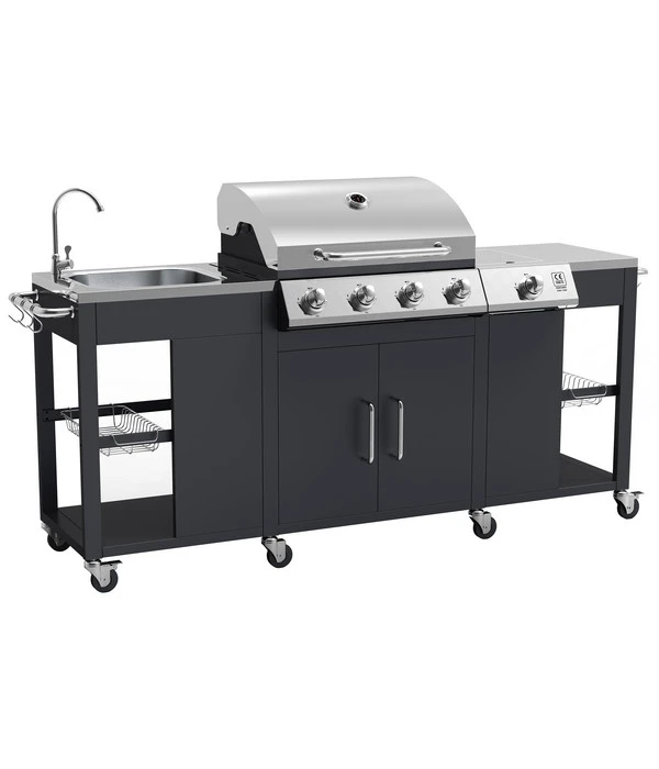 4 Edelstahlbrenner, Spülbecken, Arbeitsfläche & Stauraum